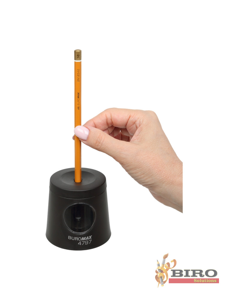 Ascuțitoarea automată (electrică) de la BUROMAX oferă o ascuțire rapidă, ușoară și de calitate pentru creioane. Este compatibilă atât cu creioane grafit, cât și cu cele colorate. Designul compact și elegant, în formă cilindrică, cu un finisaj negru mat, o face ideală pentru biroul unui elev, student sau angajat de birou.