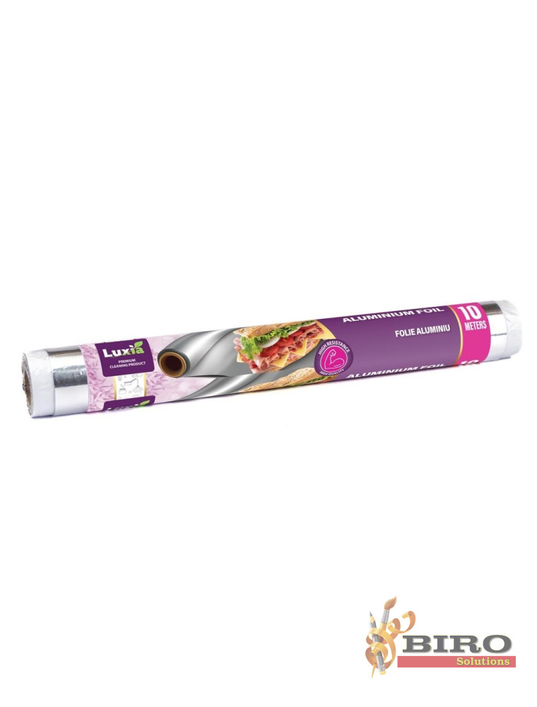 Folia de aluminiu LUXIA, cod LUX-4000, este un produs indispensabil în orice bucătărie, atât acasă cât și în mediul profesional. Cu o lungime de 10 metri, această folie este ideală pentru coacere, prăjire, gătire la abur, dar și pentru ambalarea alimentelor.