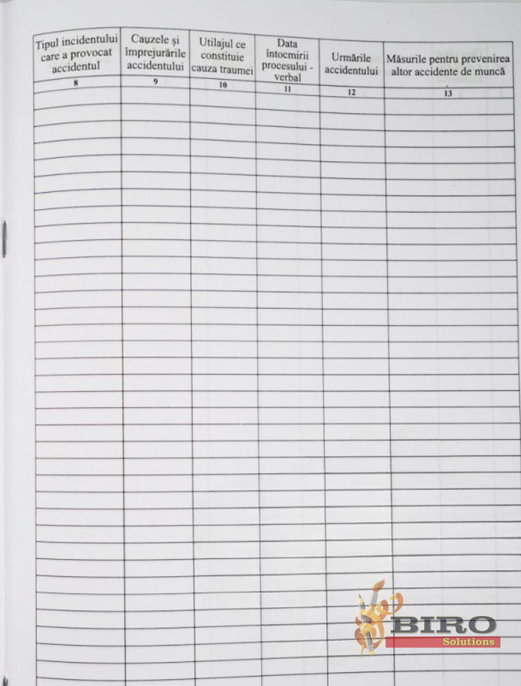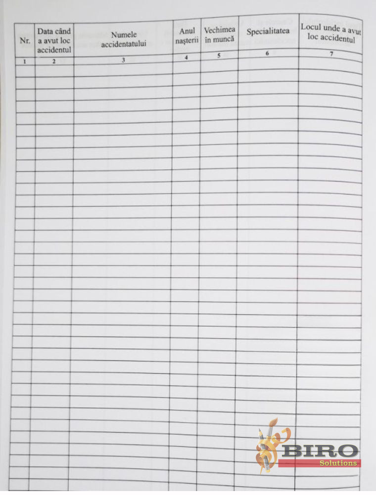 Produsul oferit de Biro Solutions este realizat pe hârtie de calitate, cu o structură clară și pagini tipizate, astfel încât informațiile importante — data evenimentului, numele persoanei accidentate, circumstanțele, măsurile întreprinse — pot fi completate ușor și lizibil.