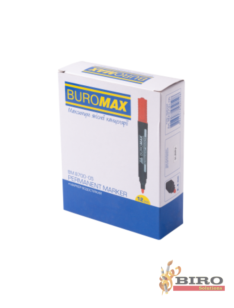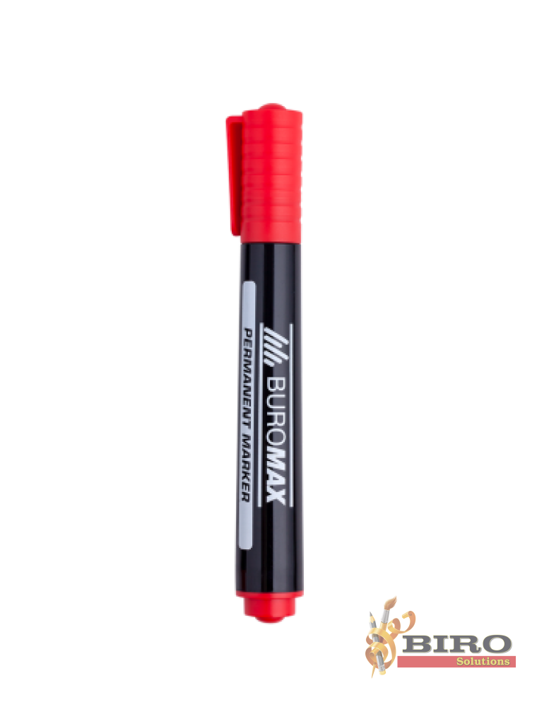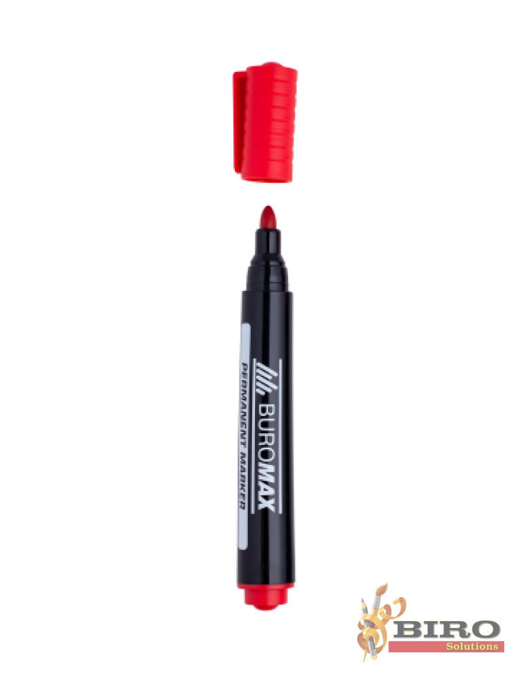 Markerul permanent BUROMAX, de culoare roșie, cu vârf de 2–4 mm și bază alcoolică, este conceput pentru marcaje clare, intense și rezistente la apă. Cerneala se usucă rapid, nu se estompează și oferă o vizibilitate excelentă pe diferite suprafețe.